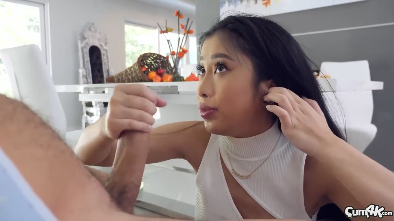 Завтрак был прекрасен - аппетитная лазанья была такой вкусной, что если бы в этой семье не следили за весом, ее можно было бы есть бесконечно. Но не для этого белый богатый мужчина женился на этой молодой азиатской куртизанке. Потому что после замечательной трапезы узкоглазой девахе настало время отрабатывать свой супружеский долг, а именно долго и со вкусом ебаться. Первым делом нужно оформить ему минет, расстегнув ширинку и получив классный куни в подарок. А потом шла методичная и размеренная ебля, обязательным условием которой было окончание внутрь азиатки.