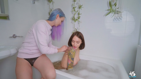 Одна девушка приехала к другой в гости. Перед прогулкой хозяйка залезла в ванную, устроив небольшой пранк. Поздоровавшись с будущими зрителями, она поставила камеру напротив, сняла халат и залезла в теплую водичку. Не подождав и минуты, брюнетка позвала Сию потереть спинку, а сама развела ее на секс. Когда та массировала спинку, сучка достала два дилдо, спрятанные под пеной. Рассмеявшись, подружки поцеловались и гостья тоже залезла в ванную, примерить друг в друге фаллосы и отлизав в конце чистую писечку перевозбужденной лесбиянки.