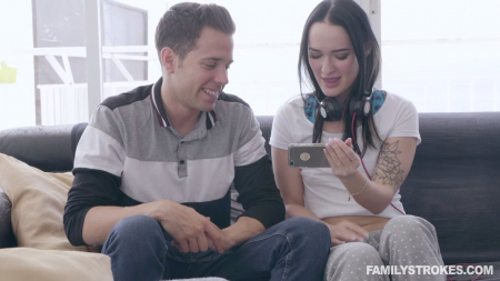 Молодка (кстати, россиянка) спустилась по лестнице с яблоком в одной руке, телефоном в другой, со вставленными в него наушниками. Она решилась незаметно для сводного брата помастурбировать на пикантное нечто, да вот слишком увлеклась, начав стонать громче задуманного, да и экран даже издалека прекрасно видно. Он не стал скрывать, что заметил мимолетное помутнение сестренки, но та напротив, подсела поближе и показала воспроизведенное на мобильном устройстве, надеясь получить хоть какую-то положительную реакцию и дождалась. Страстный поцелуй стал преддверием соития молодых.