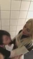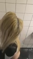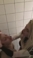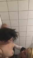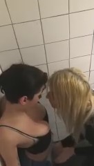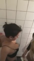 Веселье в самом разгаре ночного заведения. Громкая музыка, танцы, обжимания, крепкий и не очень алкоголь льются рекой. Две девушки блондинка и брюнетка ушли посетить туалет. Ну как это обычно и бывает, ходят парой. Но кто-то из знакомых стал подозревать неладное, так как их слишком долго не было. А тут еще такие сортиры, что есть возможность заглянуть в кабинку с помощью телефона, если высоко поднять руку над головой. Они там лобызают писечки, жмякают сиськи, а прекрасная девка с короткой стрижкой подняла голову и заметила съемку, улыбаясь отодвинув телефон рукой.