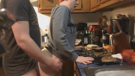 Готовящая ужин домохозяйка услышала как сзади подкрадывается любимый и заулыбалась. Все потому, что он пришел с приспущенными штанами, резко сдернул ее штаны и вставил член, заставив оторваться от домашних хлопот на кухне. Лоно девушки быстро намокло и смогло впустить в себя сожителя. Она выгибается буквой "зю", спина напоминает кофейных червей из киноленты "Люди в черном". От удовольствия и для удобства героиня становится на цыпочки, поднимаясь чуть выше. И снова нет никакого окончания, запись резко обрывается в процессе простого семейного времяпрепровождения под телевизор, который никто не смотрит.
