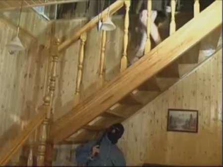 Неизвестному в балаклаве оказалось слишком легко попасть на дачный участок одинокой девушки. Он подкараулил ее под лестницей и, когда та спускалась со второго этажа на первый, выскочил, изрядно напугав. Показывая пальцем жест молчания, он заставил под дулом пистолета вернуться обратно, проверил там все тумбочки, но никаких ценностей не нашел. Тогда он сдернул с себя всю одежду, показал лицо, и принялся за хозяйку, ведь ему совсем не хотелось уходить ни с чем. В самом конце видео битое, самое интересное - целое, так что не переживайте.