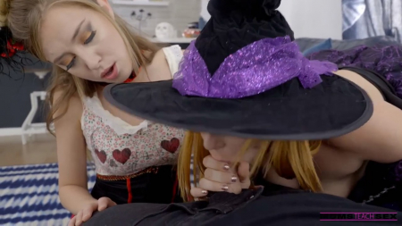 Ночью состоится вечеринка в честь Хэллоуина. Вся семья придумала и надела костюмы, а сынок решил подшутить над сестрой. Он засунул в вазу с конфетами хуй, дав не глядя выбрать самое вкусное угощение сестре. Она оценила эту шутку и предложила повторить с мачехой. Та быстро нащупала кожаный леденец, через секунду позвала папу чтобы сорванца наказали. Придется постоять в углу до вечера. Первой стало жалко члена семьи сестре, она успела только показать сиськи когда послышались приближающиеся шаги матушки. Рыжая женщина видела что делала дочка и тоже светанула сиськами, жопой, теперь позвала дочурку чтобы они вместе сгладили плохое впечатление от начала праздника. От первого лица брат и сын в одном лице выебал обеих хорошеньких баб.