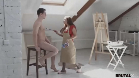 В помещении находятся двое: голый натурщик и художница, которая рисует с него образ. Тот начал вошкаться, все тело затекло от сидения неподвижно перед девушкой, да и думать приходится о чем-то отвлеченном чтобы не замучил стояк. Мелкая сука подошла наругать парня, но тот не даст себя в обиду. Отобрав мольберт, от несколько раз ударил по лицу девушку, разорвал на ней одежду, силой заставил сосать. Если бы не громкая музыка, мы бы услышали ее крики, а пока терпим и смотрим визуал. Уже испорчены колготки - их некогда было снимать, а сука наказана в разъебанную пизду. Пусть теперь смешивает краски с кончой.