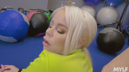 В гордом одиночестве красивая блондинка занимается фитнесом. Очень напряженная тренировка получается. Старания заметил молодой парень, похваливший барби за старания. Он предложил помочь с напряжением в ногах и, после получения согласия, сел рядом на пол, массируя мышцы почти стонущей девушки, вот-вот перешагнувшей в категорию милф. Та извинилась за столь неоднозначное придыхание, предложила чтобы она перевернулась, а потом попросила стянуть с нее спортивные обтягивающие трусики, ему так удобней делать массаж попки. Возбуждению нет предела у обоих - теперь она больше не может ждать заполнения членом своей киски и отдается в зале под матерную русскую озвучку.