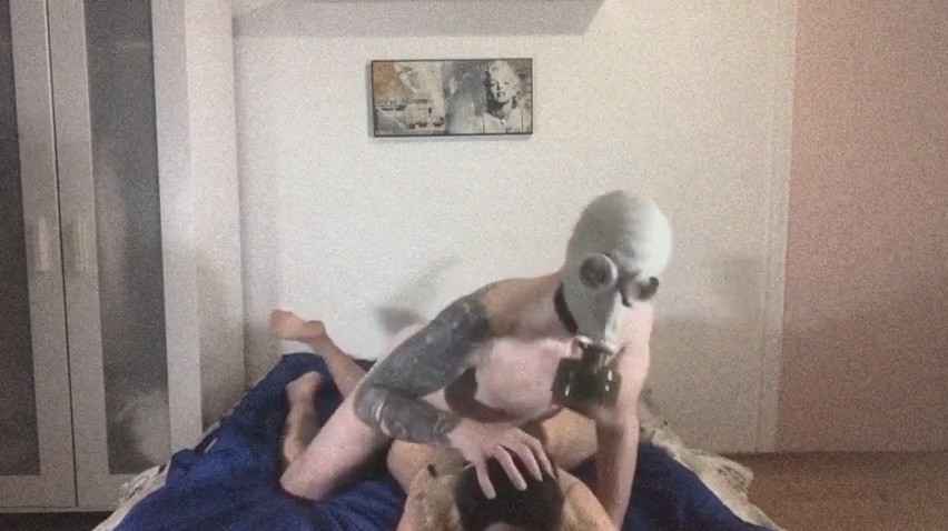 Сперва они оба медленно мастурбировали, повернувшись глазами в сторону камеры. Интересная парочка надела по разному противогазу - парню достался просто армейский, а вот у девушки респиратор. Его рука заняла место у вагины, а когда стало достаточно влажно, крупная жена залезла сверху на партнера. Камера выдает артефакты как от радиации, на этом, собственно, смысл их ролика и построен - как приходится трахаться в страшных условиях невидимой смерти. Бабу попердолилили налево и направо раком, пока картинка совсем не стала черно-белой при миссионерской позиции.