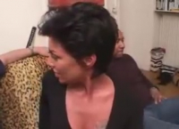 Воспроизводя первую фразу на французском, дама замолкает. Потому что дальше звука не будет, мы не услышим как она орет от боли в очке, когда ровесники милфы будут долбить ее и не одним хуем одновременно. Короткостриженная лапочка занялась отсосом, сзади мужики занялись тем, что припихуярили в дупло. Ее вертят по кругу, хрен разберешь в такой суматохе кто ее шпилит, в какое отверстие. Следом двойное проникновение, очередной минет - по записи видно как пасть широко открылась в неистовом крике кайфа. Ну а напоследок женщине обкончали табло. Что она творит со своими сиськами, бедные!