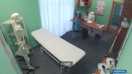 "Боже, что это за шум? Это пациенты за дверью?" - сетовал взрослый мужчина в белом халате, выглянувший посмотреть на очередь. Да уж, сегодня денек тяжелый: мало того, что работа сложная, так еще и приходят всякие российские студентки в чешскую больницу с жалобами на боли в спине. Увидев полностью голый большой бюст, специалист сразу смог поставить диагноз - боли в спине именно из-за него - нужны массажи, процедуры, начать стоит прямо сейчас пока не поздно. От запаха и фигурки девушки у мужчины встал, скрывать стояк практически невозможно, а шлюшка даже не расстроилась этому явлению, так как давно не ебалась, да и плевать на камеры во всех углах медицинского кабинета.
