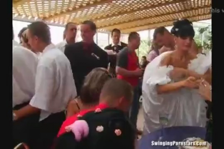 Пока вокруг народ шумно выпивает, в самом центре развлекается невеста - ее пускают по кругу. Буквально кто угодно может из мужиков подойти напихать промеж половых губ сексапильной женщине за столом. Невеста и кое-кто из гостей тоже не отстает и пытается получить свой кусок удовольствия. Вообще, трудно разобрать кто кого ебет, но чел в костюме католического священника удивил - он просто дрочит на трахающихся, а на свадебной оргии он умудрился поднести хер к лицу невесты, решившей взять временную передышку. На такую свадьбу не грех и кредит взять, чтобы посмотреть на близких друзей в пикантном положении дел.