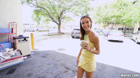 Незнакомка не сразу остановилась поговорить с незнакомым парнем, который очень просил с ним поболтать, не забесплатно. Такая тут жара, но 20 баксов - это 20 баксов, их не так просто заработать, но за легкие вопросы - почему бы и нет. Сумма в руке девушки все увеличивалась и она может стать еще больше, если согрешит с ним где-нибудь подальше от людей. Закуток улицы оказался вполне подходящим местом. Член у парня как весомый аргумент, заставил снятую шлюшку пойти на дальнейшие приключения на чужом дворе с бассейном, где худышку оттрахали вагинально от POV-вида и даже дали немного искупнуться.