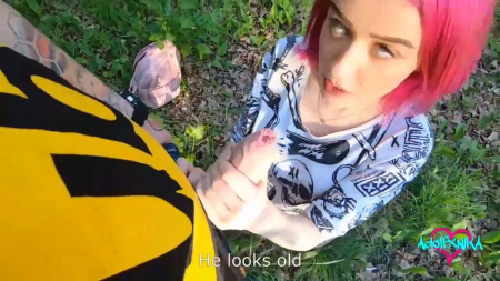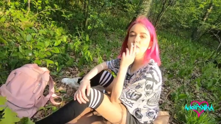 Прогуливаясь по лесу, парень заприметил странную розововолосую незнакомку, которая сидела одна на пледе и курила. Подойдя поговорить он выяснил, что ее 20-летний молодой человек ничего не может купить, а ссора произошла из-за выхода нового айфона, который содержанка затребовала сразу же. Но достаточно ли хорошо она сосет? Нужно выяснить! Пацан предложил попробовать его шишку, оказавшийся крепче и больше, чем у ее бойфренда, а также ей интересно было потрахаться через разорванные на юной заднице колготки. Шлюшка попросила обкончать ей лицо, отчего настроение только поднялось.