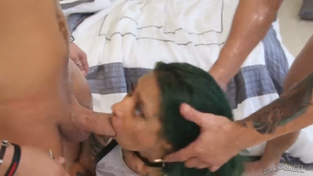 Татуированная шлюшка, когда выходит нас порадовать собственным телом, выглядит не такой страшной с кляпом во рту, но когда она от него избавляется, то лучше не смотреть на зеленоволосую морду и ее огромный нос. Дрянь в мягких наручниках отдается двум парням, дико отъебавшим ее тугие загорелые дырки двумя членами одновременно. Шлюха смотрит преданными, наполненными радостью и кайфом глазами на своих ебырей и, скорее всего, неоднократно кончает от перманентного перевозбуждения. Даже сперму на еблет девка принимает с какой-то невыносимой улыбкой.