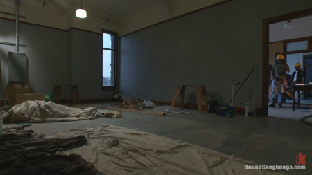 Строительная бригада всем скопом вышла покурить, а когда ребята вернулись, то их ждал сюрприз - спящий на полу чувак. Его выгнали, но работать злые бездельники не стали, даже когда пришла повыебываться начальница на счет дедлайна, который ей поставил покупатель дома. Черные рабочие обступили всей кучкой леди и, грубо схватив за глотку, закрепили между собой ее ноги стяжками, жестко заставив сосать у каждого. Потаскуху не по своей воле раздели до нитки, делая красным ее попку всеми подручными предметами, отчего та орала, дрыгалась, но в жопу и пизду все равно проникали пенисы злодеев. В конце голову замотали полиэтиленовым пакетом, полностью обездвижив, и надев желтую каску на голову ради забавы, съебались.