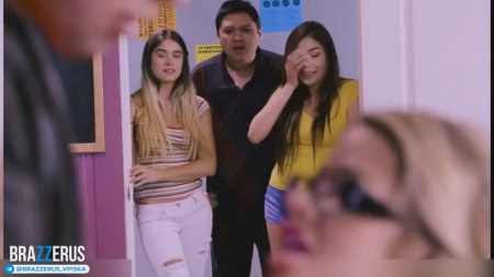 Новую преподавательницу никто не слушает или не слышит, так как абсолютно весь класс, в том числе и две девочки, уставились на ее распахнутую рубашку. Бюст там что надо. Пока блондинка пытается добиться от учеников внимания, приходит их одноклассник, помешанный на порнухе. Он вообще не обращает внимание что происходит вокруг, единственное что его удивило, так это то, что лицо училки очень знакомо. Не преподавала ли она раньше здесь? Нет, она же порнозвезда! Наша новая учительница - порнозвезда, которую ебет в видео на телефоне! Никто не поверил, но она попросила всех удалиться из класса, а сама вывалила сиськи и заставила их облизывать, ими же отдрочив. Ребята за спиной стояли и снимали - не такой уж лошок этот парень, раз выебал твердым членом такую биксу.