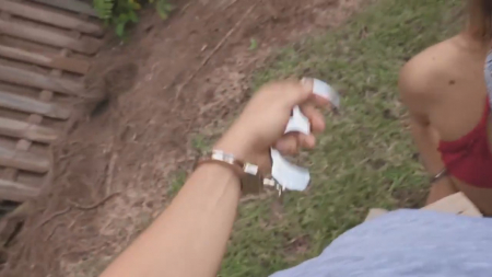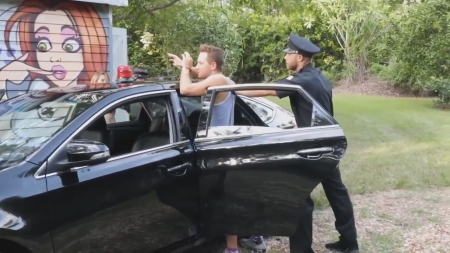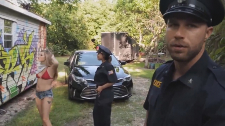Молодой человек с подружкой пришли в тихое место разрисовать чей-то дом. Озабоченная чикуля захотела показать сиськи и даже не услышала как сзади крадется полицейская машина, хотя парнишка ей всем видом намекал на это. В итоге парочку повязали и они оба уже сидят на заднем сидении автомобиля в наручниках за порчу чужого имущества. Пока менты соображали как поступить, граффитистка сделала минет приятелю, а потом вандалы побежали прочь, так как полицейские их просто прошляпили. Убежав на безопасное расстояние, ребята занялись сексом под открытым небом, даже браслеты им не помешали, зато помешали полисмены, сумевшие найти любовников по горячим следам.