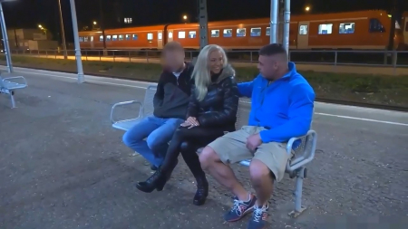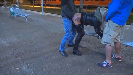 Не боящаяся ночных приключений немецкая потаскуха отправилась на поиски с кем поебаться в такое позднее время. Обычно на вокзалах сидят мужики и ждут свой поезд, вот и в этот раз попалось сразу двое друзей на платформе. Чикуля села между них, до этого постояв какое-то время, чтобы они оценили обтягивающие штанишки незнакомки, после чего начала гладить их ноги, непрозрачно намекая на продолжение. Так как лавочка довольно холодная и вообще лучше не раздеваться, дабы не застудить кормилицу, баба приспустила с жопы штаны, призагнувшись рачком, пока второй давал спереди в рот. Оба ночных приятеля обкончали ебасос шалавы, а та пошла в таком виде дальше, ехать ей никуда не нужно.