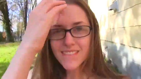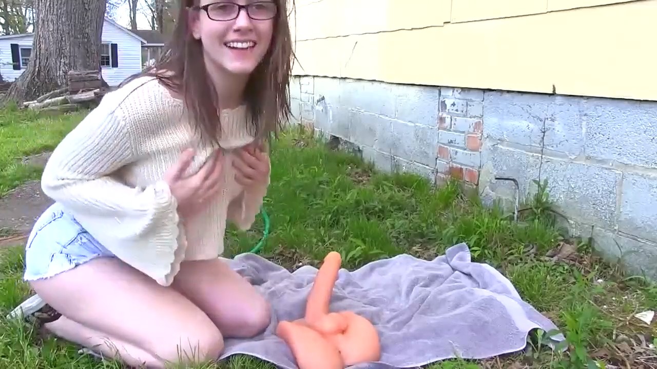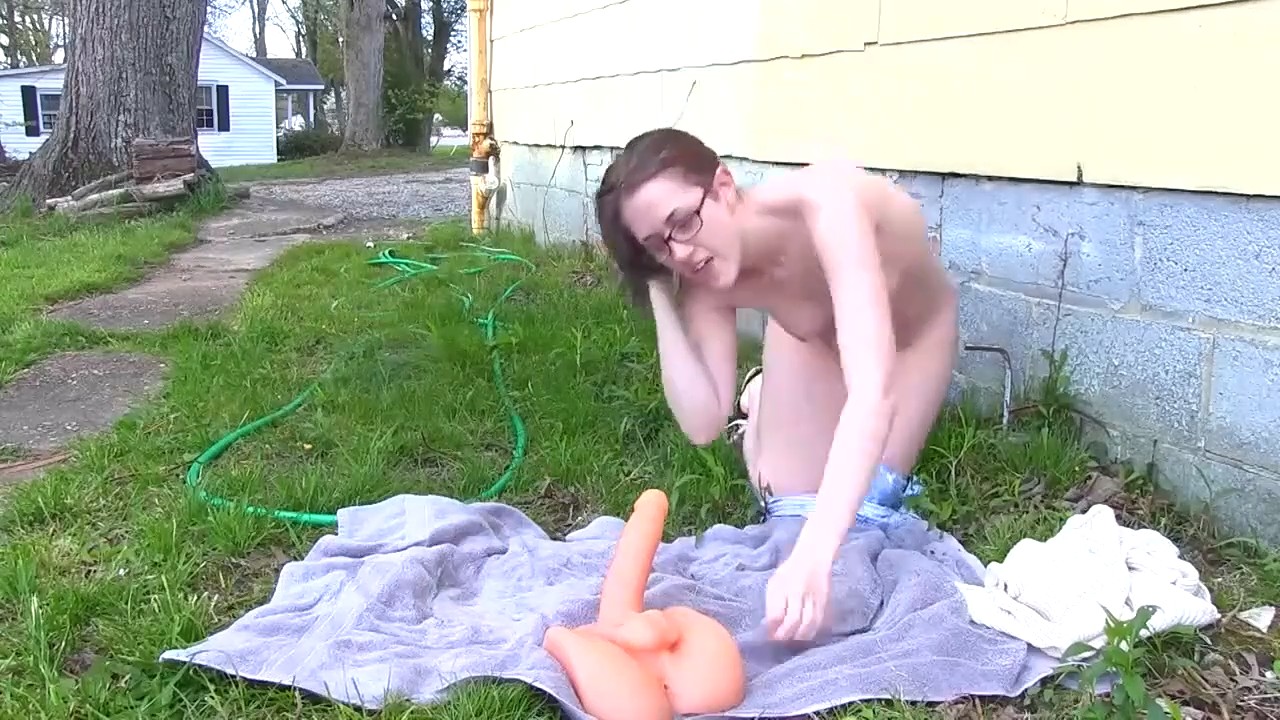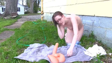 Завернув интересный фаллоимитатор в полотенец, четырехглазая эксгибиционистка пронесла на улицу игрушку и спряталась сбоку собственного дома, где проходит довольно оживленная дорога с проезжающими машинами раз в несколько секунд. Девчонка разделась догола, облизала резиновый член с частью паха и стала прыгать на нем сверху, ускоряя пик удовольствия рукой. Ей было интересно попробовать помастурбировать практически публично и не попасться, ну вот есть такое - заводит когда можешь быть застуканной в необычном месте даже случайным свидетелем.