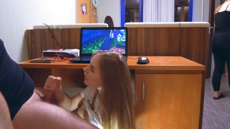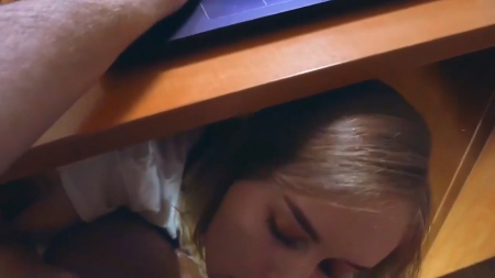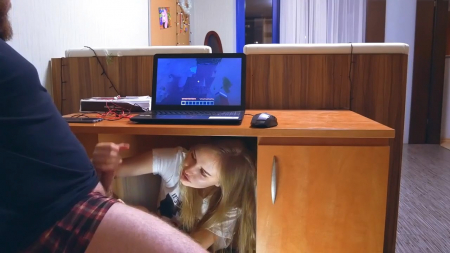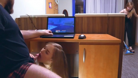Сосет под столом играющему в Майнкрафт брату с матерью в одной комнатеHD