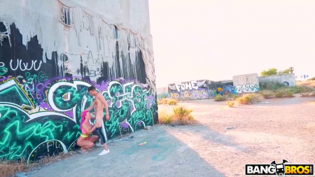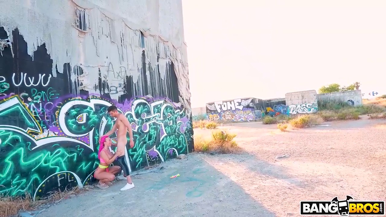 Вместе с худеньким подтянутым парнем милая девушка с розовыми волосами спряталась за расписанную граффити стену, чтобы придаться с ним порыву чувств, исходящих прямо из нутра. Вдалеке видны другие люди, но это никак не остановит красавицу, собравшуюся как следует оторваться с симпатичным молодым человеком, который ей дал на клык и принялся долбить только шлюшью анальную дырку публично под жарким солнцем. Россиянка ведь могла стать просто моделью, но жажда наживы и большой интерес публики сделали свое дело - мы любуемся как ее смачно и профессионально прожаривает пиздюк немалым членом на земле при всех, но хотя бы подстелив коврик.