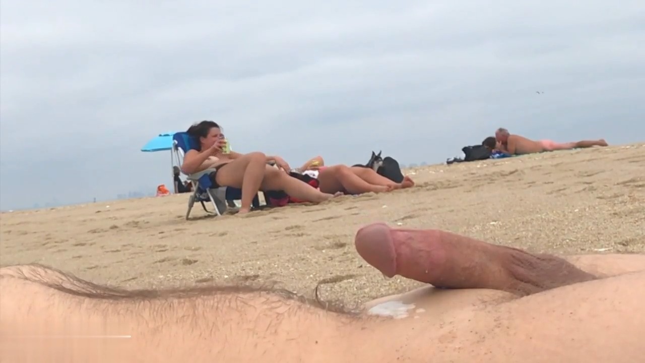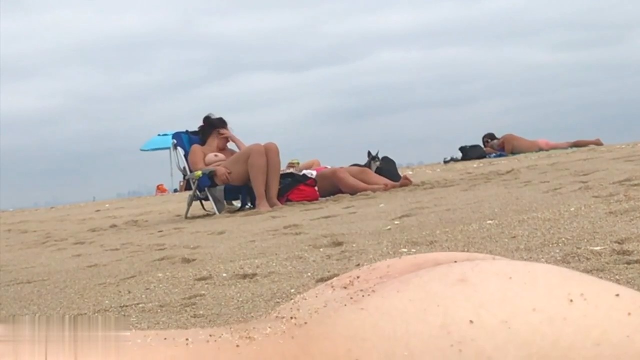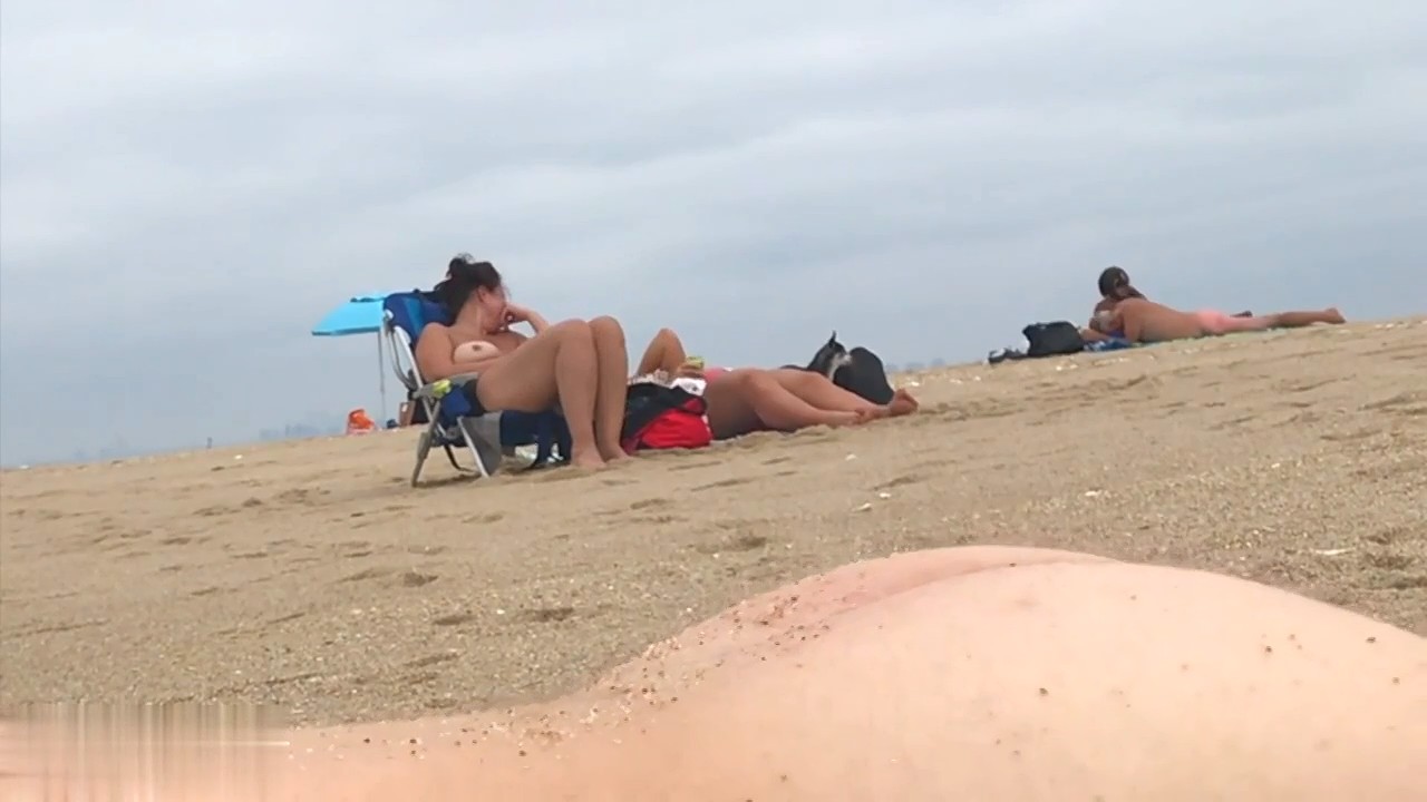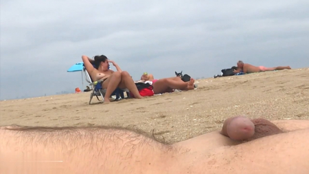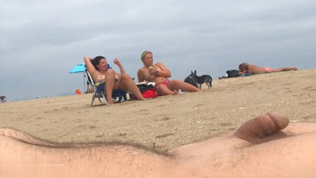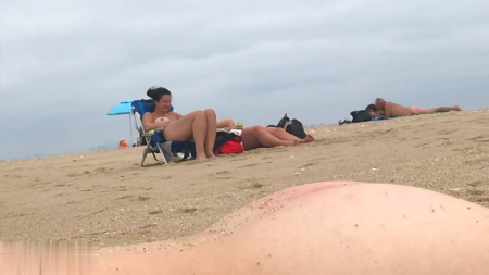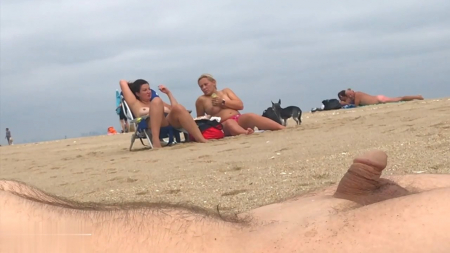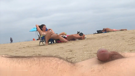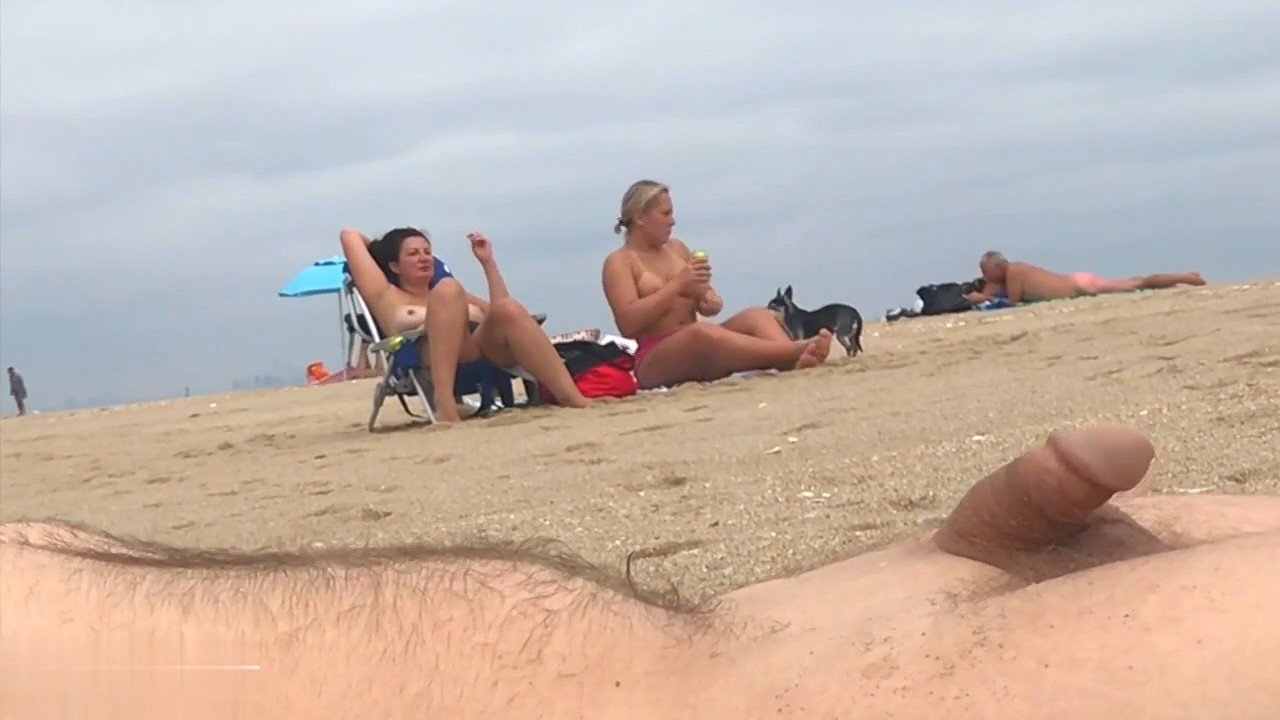 Эксгибиционисты раскиданы по всему пляжу. Погода не такая, чтобы прям загорать, но многие приходят сюда пообщаться на свежем воздухе, например, как две разного цвета волос зрелые подруги, заметившие лежащего мужчину, чей маленький хуек стал подниматься на их милфные тела. Буквально минуты четкого самоконтроля хватило, чтобы начать кончать себе на живот на тетушек, перешептывающихся между друг другом и поглядывающих на половой орган с улыбкой. Пришлось перевернуться на живот мужичку со скрытой камерой, чтобы больше не стеснять нудисток.