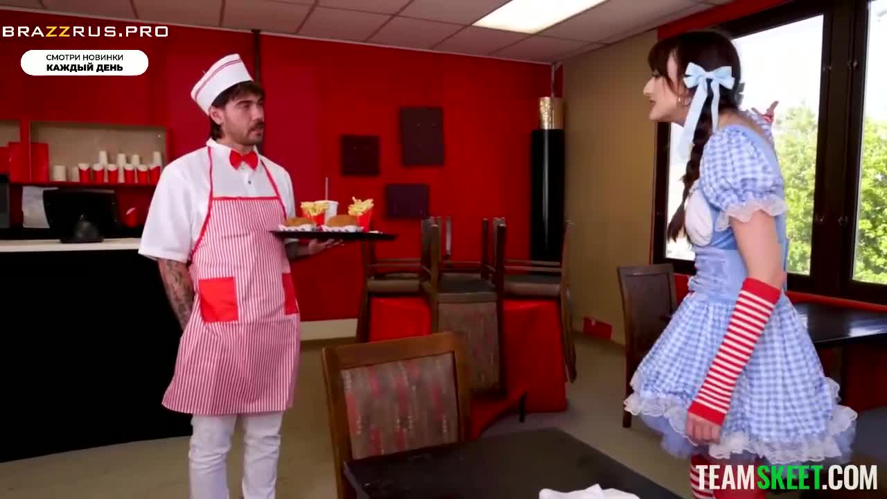 Нарядная официантка в день труда решила послать начальника на три буквы и, наконец-то, бросить эту поганую работу. Он еще и выбесить успел тем, что приготовил завтрак в виде двух жалких бургеров и пары порций картошки фри. Явно не этого ожидала шлюха, растоптавшая его пилотку. Она не уволится только если начальник сделает ее вторым менеджером! Что ж, об этом стоит подумать, но чтобы принять взвешенное решение, ей нужно как следует постараться. Благо, что она реальная шлюха, дававшая половину видео интервью, и ей есть что показать в постели, хотя таковой в кафе и нет вовсе. Зато есть упомянутая выше картошка фри со спермой и дрянь ее попробует.
