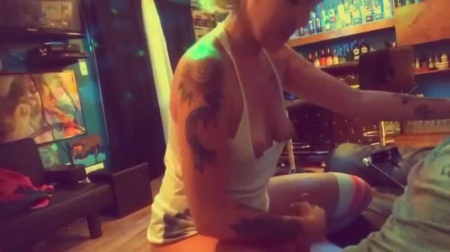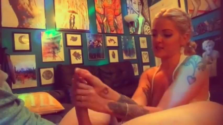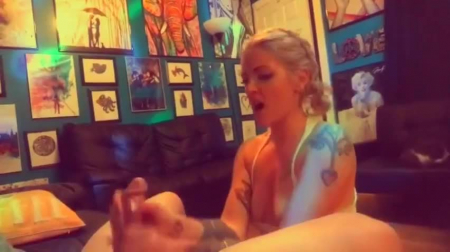 Среди десятков бутылок с элитным спиртным и картинами расселся парень на кожаном диване. Между его ног расположилась симпатичная девушка с сиськами наружу, чьи соски проколоты пирсингом, как и игривый язычок этой соски. Камера делает акцент на ее теплые чулочки, а также на дрочащие член обе руки. Вскоре минетчица опускается на колени и начинает посасывать ствол, все еще методично гоняя шкурку. Счастливчик чутка наклоняется вперед, чтобы запечатлеть голую пилотку татуированной подружки, которой нравится что происходит вокруг нее. Ей точно было бы приятно знать, что именно вы сейчас смотрите как она сосет приятелю.