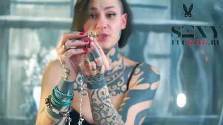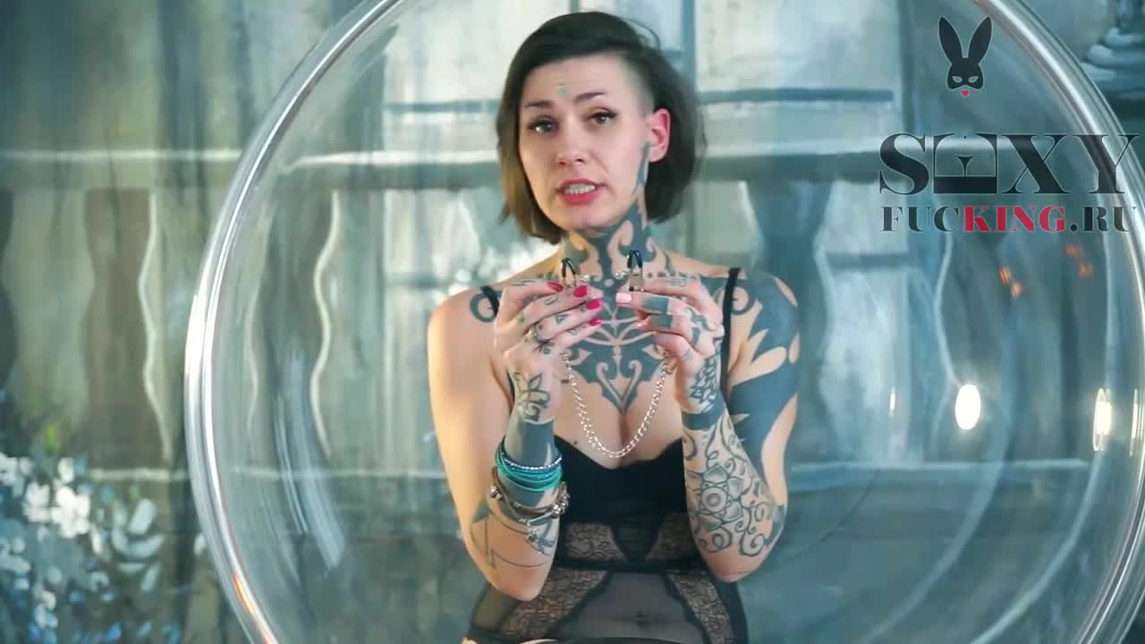 "Привет! Меня зовут Матильда и сейчас я расскажу вам про зажимы для сосков. Конечно, эти штучки подойдут не всем, но если твои сосочки эрогенные, чувствительные и ты любишь их ласкать - рекомендую. Бывают несколько видов зажимов: первый вариант - это зажимы, где усилия осуществляется за счет пружины, а с помощью винтика вы можете их только ослабить. Но как правило пружины не хватает для того, чтобы оказать достаточный эффект, поэтому такие зажимы лучше всего подойдут для какой-нибудь фетиш-игры. Напомню: чтобы эффект был, ощущения должны быть на грани боли. Поэтому лично я предпочитаю вот такие зажимы, которые подойдут как для фетиша, так и для практики. Сила регулируется здесь колечком." Красивая русская татуированная девушка в видео рассказывает и показывает на собственной груди все три экземпляра интимных игрушек.