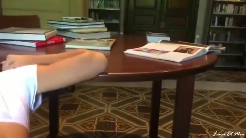 Идея заняться сексом в библиотеке принадлежала полногрудой девушке в очках, которая начала мастурбировать на камеру под столиком, за которым читала книжку, сидя напротив своего спутника. Ему она там же сделала минет и оба оказались на полу - девка с крутой попкой под красной клетчатой юбкой насаживалась киской на кукан, после чего ребята поменяли локацию, трахаясь стоя возле книжных полок. Окончание произошло на личико - там не только все лицо забрызгало, но и часть предметов местного интерьера. Слишком уж возбудился парнишка со своей ненасытной подружкой.