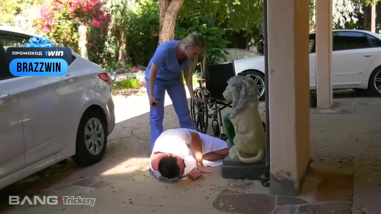 Мачо проезжал мимо и не мог не заметить аппетитную задницу домработницы, доставляющую инвалида на каталке к нему домой. Парень попытался взять телефончик, но получил отказ. Тогда он сделал несколько фотографий пятой точки на телефон и заказал себе комплект подобного медицинского оборудования. Будущий пациент притворился другим человеком, упав рядом с машиной незнакомки. Она помогла ему подняться и, так как у нее уже закончился рабочий день, красавица была свободной. Женщина помыла всего (ага, именно всего, особенно яйца) обманщика, но тот попросил помочь ему со стояком. Дальше уже дело техники, тем более шлюшка его давно узнала.