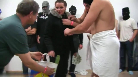 Самый разговорчивый отправился на улицу, чтобы предложить какой-нибудь незнакомке заняться сексом с толпой мужчин за деньги. Первая, вроде бы, согласилась, но потом сдала назад, поспешно засобиравшись уходить, а вот более симпатичный экземпляр был более благосклонен посотрудничать и предварительно попить пивка. Кажется, что наоборот, именно этой телочке самой хотелось поучаствовать в генг-бенге и ее довольно сильно завело то, что ее тело было покрыто семенем практически с ног до головы, да и в попку оттрахали довольно не больно, пока сучка теребила клитор, просунув руку между ног.