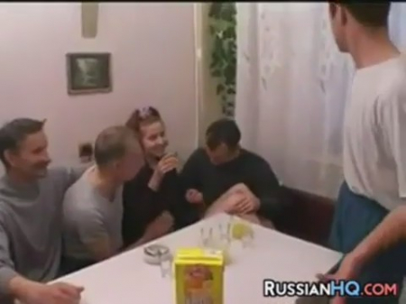 Четверо мужчин выпивают и с ними пьет рыжеволосая симпатяга. Закуски на столе нет, только "запивон", как у русских алкашей заведено. Мужики немного перепили и, конечно же, захотелось им сексуальных приключений и они стали приставать к рыжей сучке. А девушка просто без ума от бешеной "популярности", вызванной среди собутыльников. Она отдалась им, и друзья отодрали тощую симпатягу по очереди и закончали ей всю спину и попку.