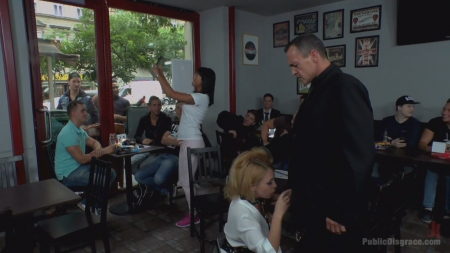 Куча мужиков смотрит как блондинку ебут в ресторанеHD