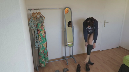 Примеряет трусики и мастурбирует возле шкафа с зеркалом
