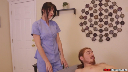 Мужчина расслабиться пожелал и записался на сеанс массажа. Стандартная подготовка занимает у мужчины всего лишь несколько минут - и вот он готовый в предвкушении ждет массажистку - голый, лишь прикрытый полотенцем в энном месте. Пришедшая симпатяга начинает натирать маслом тело, начав с ног и перейдя к плечам. И вот тут-то девушка получает непристойное предложение, от которого ну просто не может отказаться - похотливый самец полотенец вниз сдернул, показав мастеру член. Девушка согласилась, но только на своих условиях - ушла и через некоторое время вернулась с приспособлениями для бдсм. Связав клиента скотчем, милашка пережала его яйца и принялась дрочить, наслаждаясь каждой секундой. Возбудилась девушка в процессе и себе также вздрочнула. Получив удовлетворение, сексуальная крошка ушла, так и оставив мужчину связанным.
