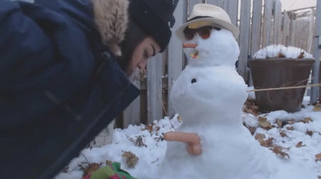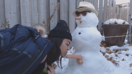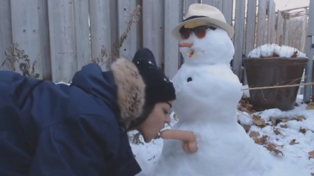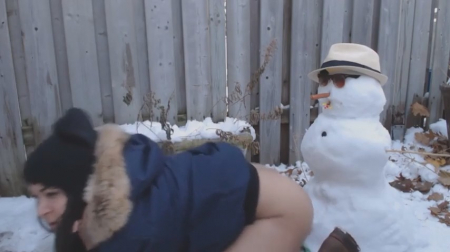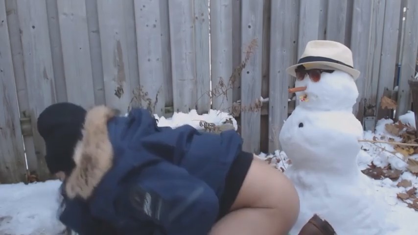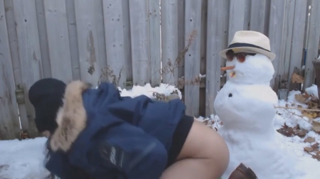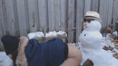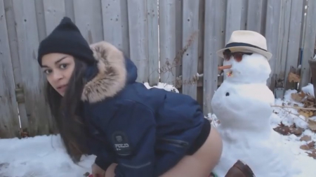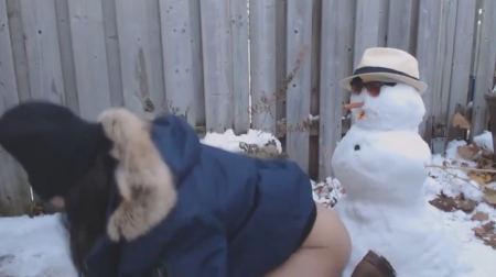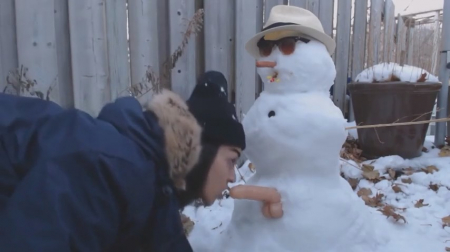 То ли совсем одичав без секса, то ли захотев экзотики и острых ощущений, но миловидная особа подрочила себе невиданным способом! Девушка слепила небольшого снеговика и нарядила его как главу мафиозного клана - шляпа, сигара, очки. Но на этом стройная брюнетка не остановилась - ведь девушка сделала снеговику хер, прилепив к нижнему шару резиновую игрушку. Не долго думая, симпатяга встала в позу догги стайл (на четвереньки) и насадилась вагиной на член снежного любовника.