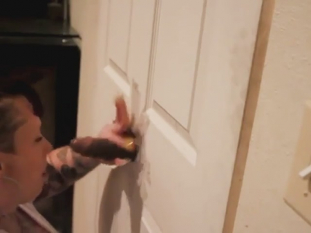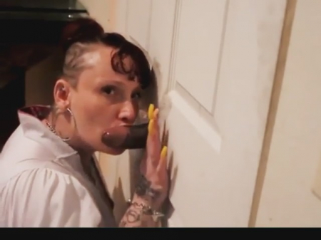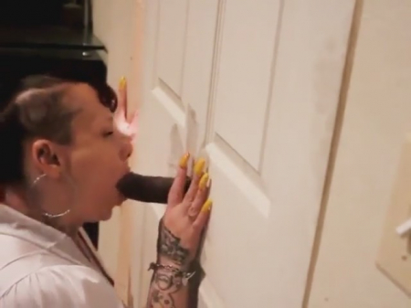 Понятия не имеем, что порадует вас больше - аккуратно высверленное отверстие под хуй в белоснежной межкомнатной двери, или забавно выбритые волосы сбоку головы у татуированной девчонки. То что важно для нее сейчас, так это то, что из этой самой двери торчит большой и черный член, который только и ждет, чтобы любопытная хозяйка взяла его в рот. А вы посмотрите на хозяйку - что про нее можно сказать точно, комплексов у нее нет. И поэтому она игриво берет в ротик черный шланг и начинает неистово сосать. Великолепный стон негрилы из-за двери намекает нам, что сперма уже дошла до рта красотки.